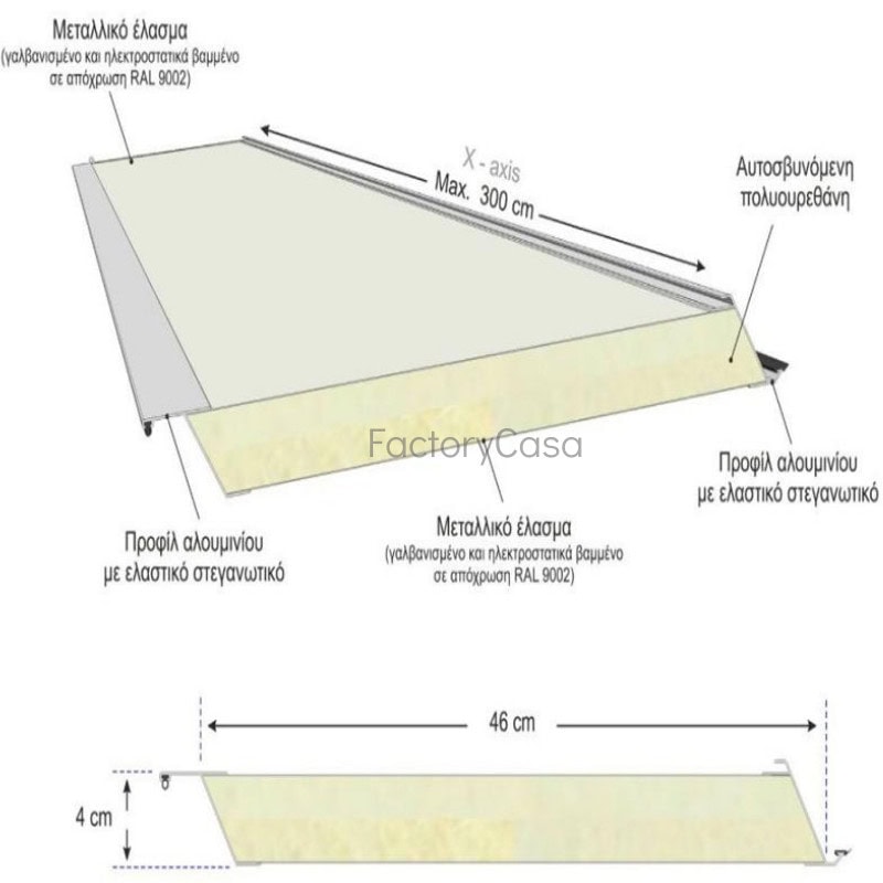 - Γαλβανισμένες λαμαρίνες, ηλεκτροστατικά βαμμένες σε απόχρωση RAL 9002 και ενδιάμεση μόνωση από πολυουρεθάνη.