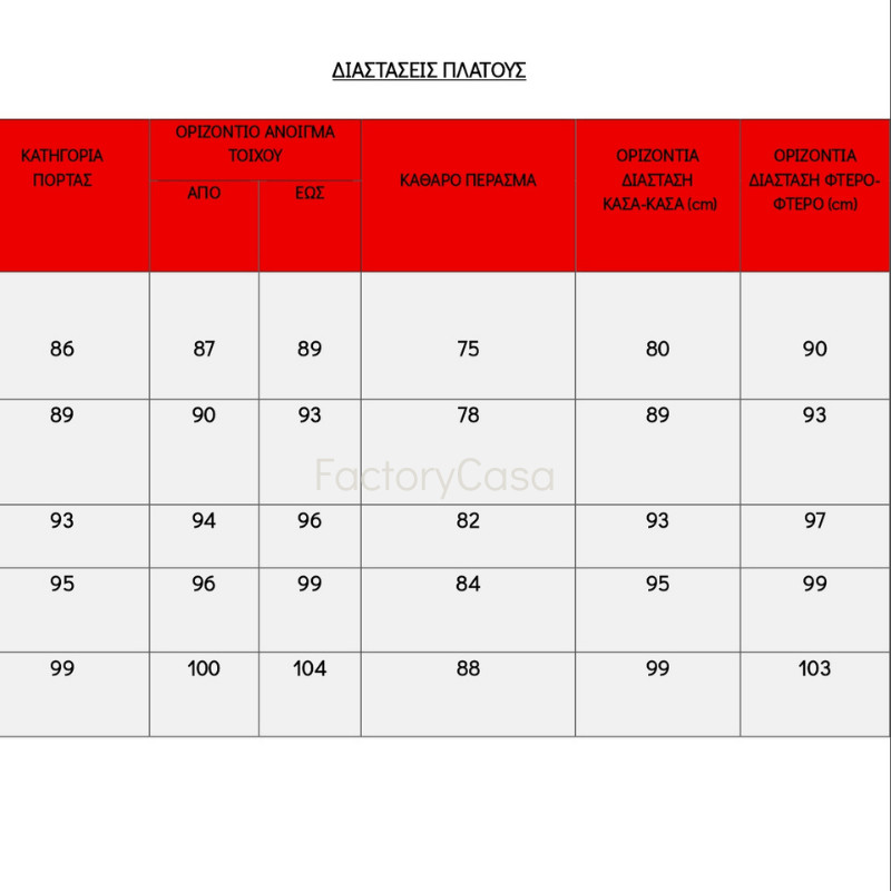 Διαστάσεις πλάτoυς από 88 έως 98 cm ανά 5cm και ύψος από 2,02 έως 2,17 ανά 5cm.