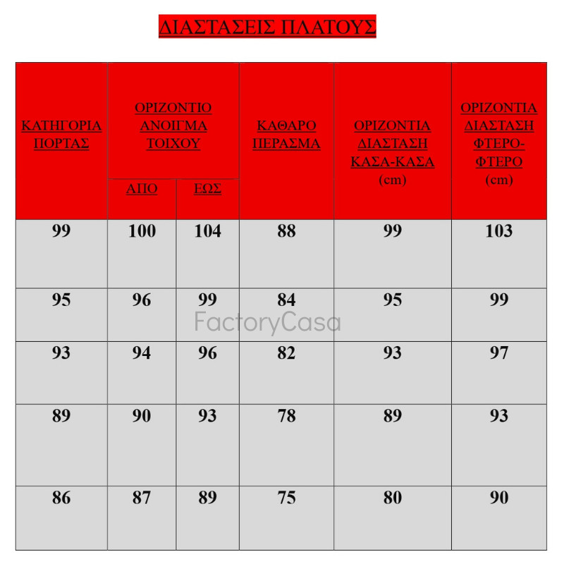Διαστάσεις πλάτoυς από 88 έως 98 cm ανά 5cm και ύψος από 2,02 έως 2,17 ανά 5cm.