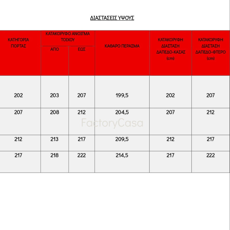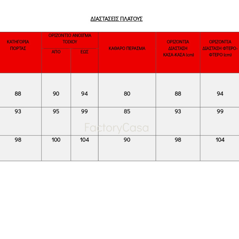 Διαστάσεις πλάτoυς από 88 έως 98 cm ανά 5cm και ύψος από 2,02 έως 2,17 ανά 5cm.